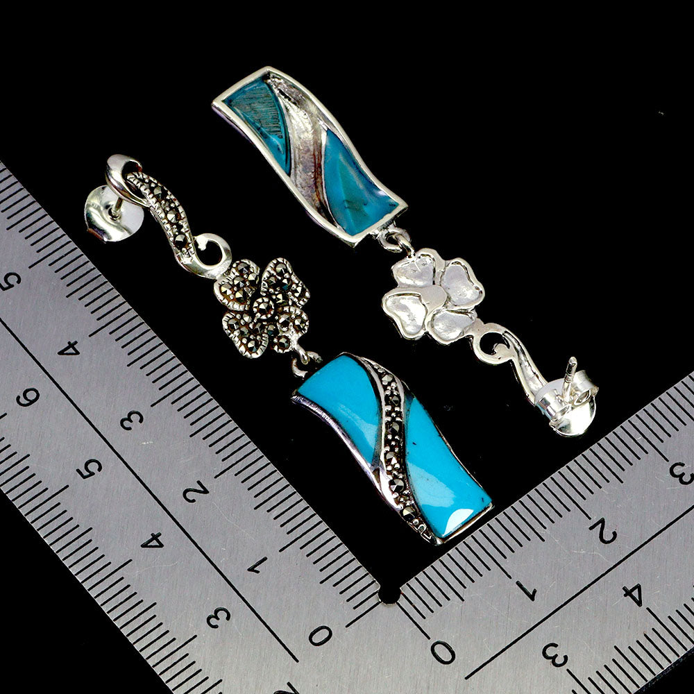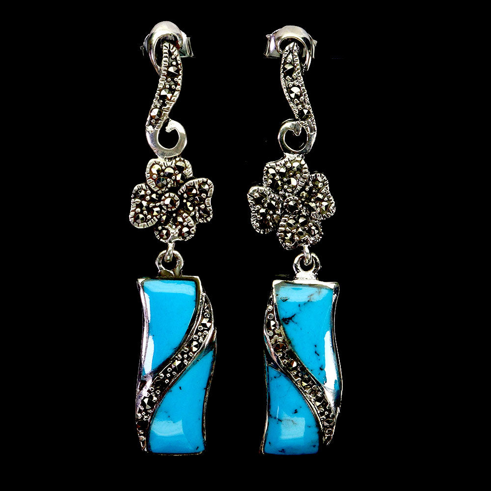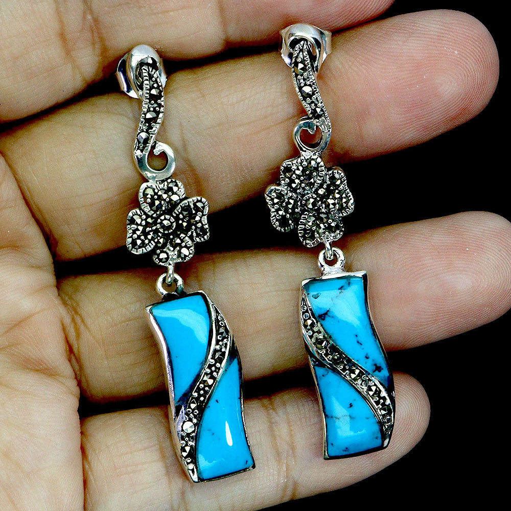 925 Sterling Silver Earrings Fancy Turquoise 14x7mm Marcasite Gemstone Jewelry