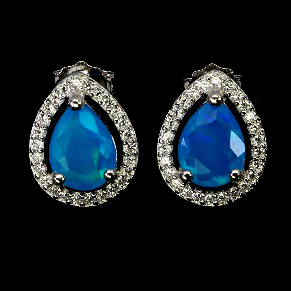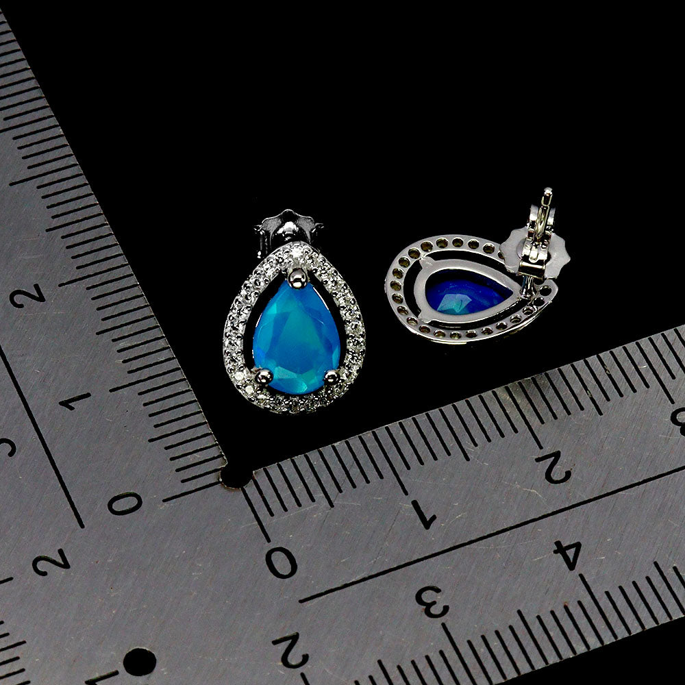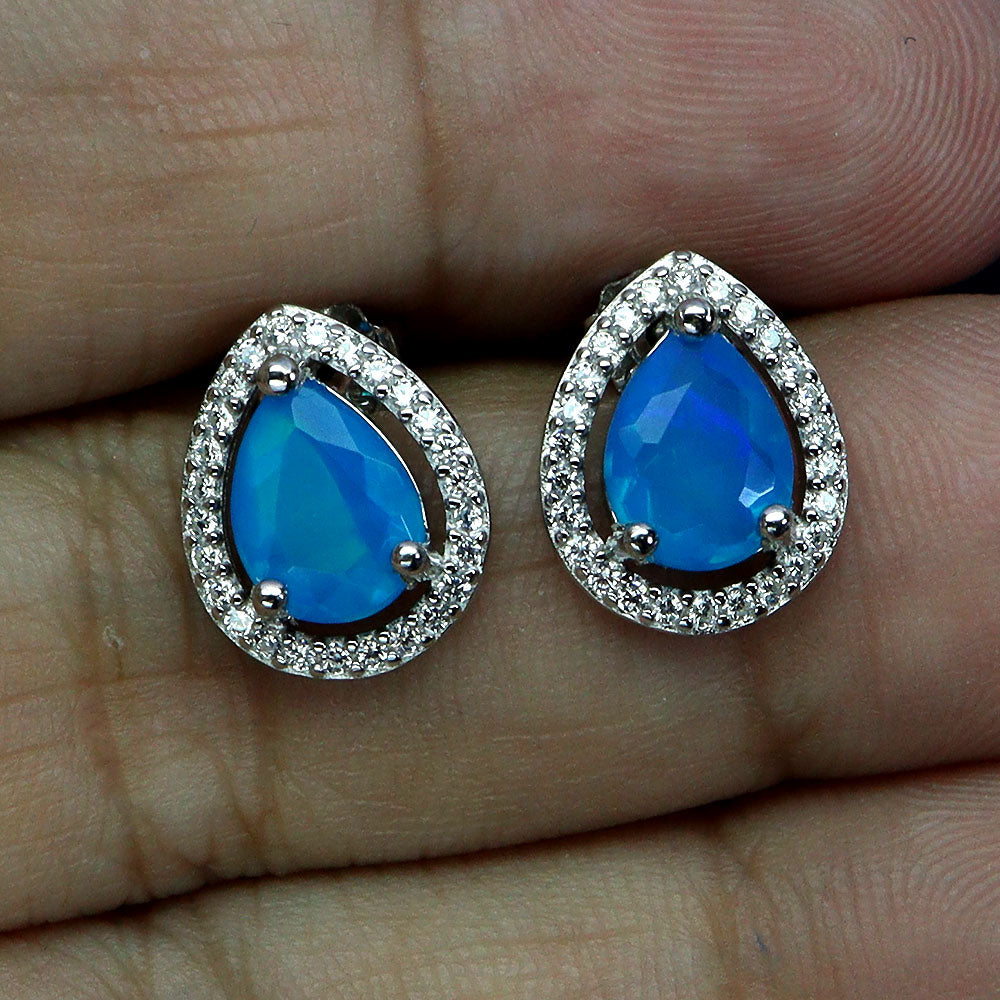 925 Sterling Silver Earrings Pear Blue Opal 8x6mm Natural Gemstone Jewelry