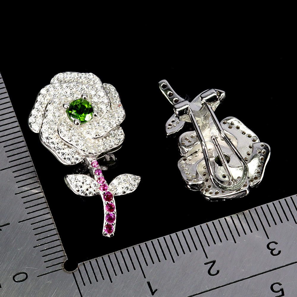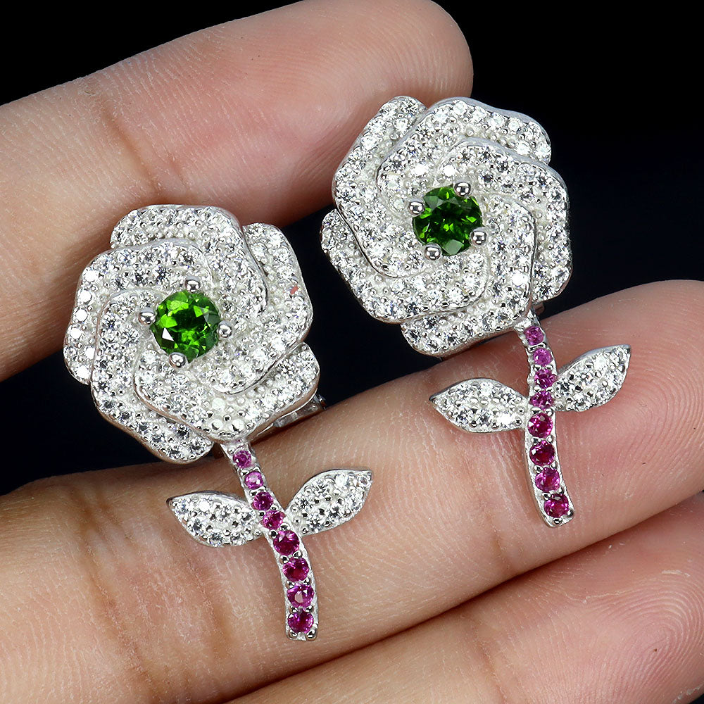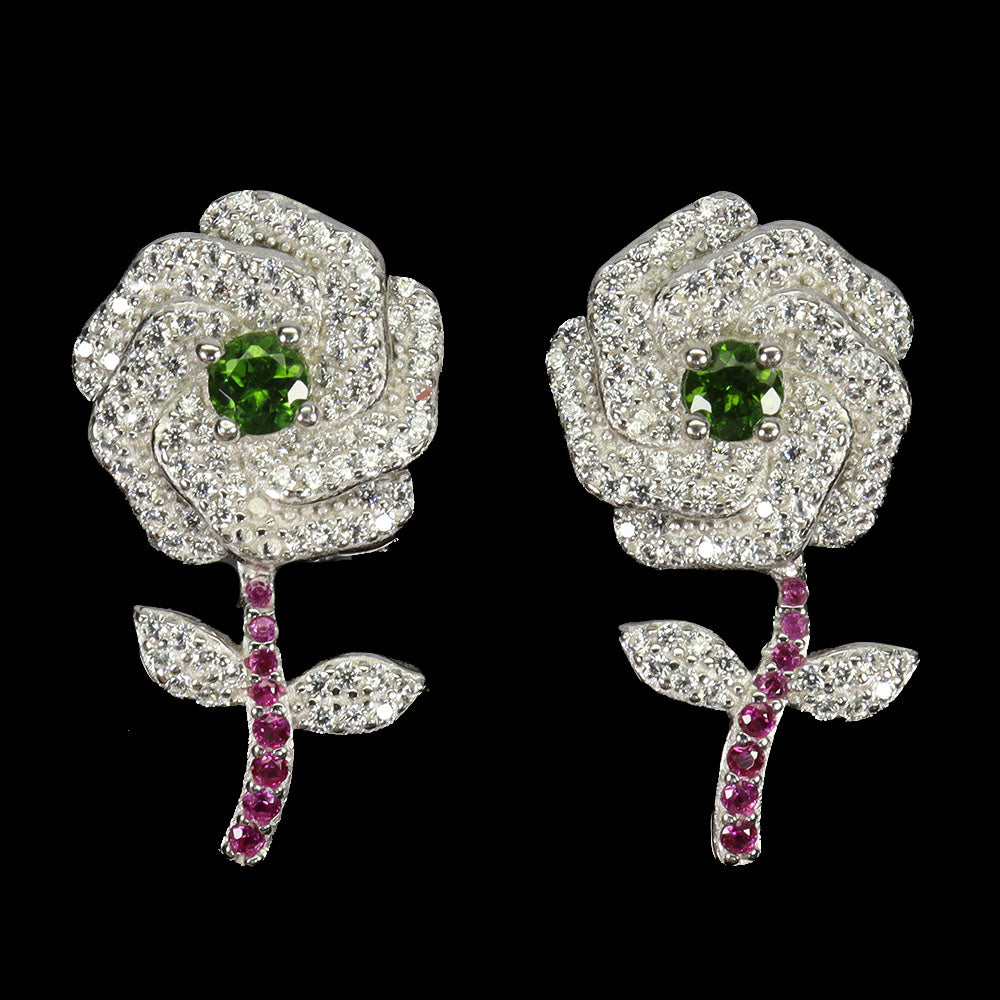 925 Sterling Silver Earrings Round Chrome Diopside 4mm Flower Gemstone Jewelry